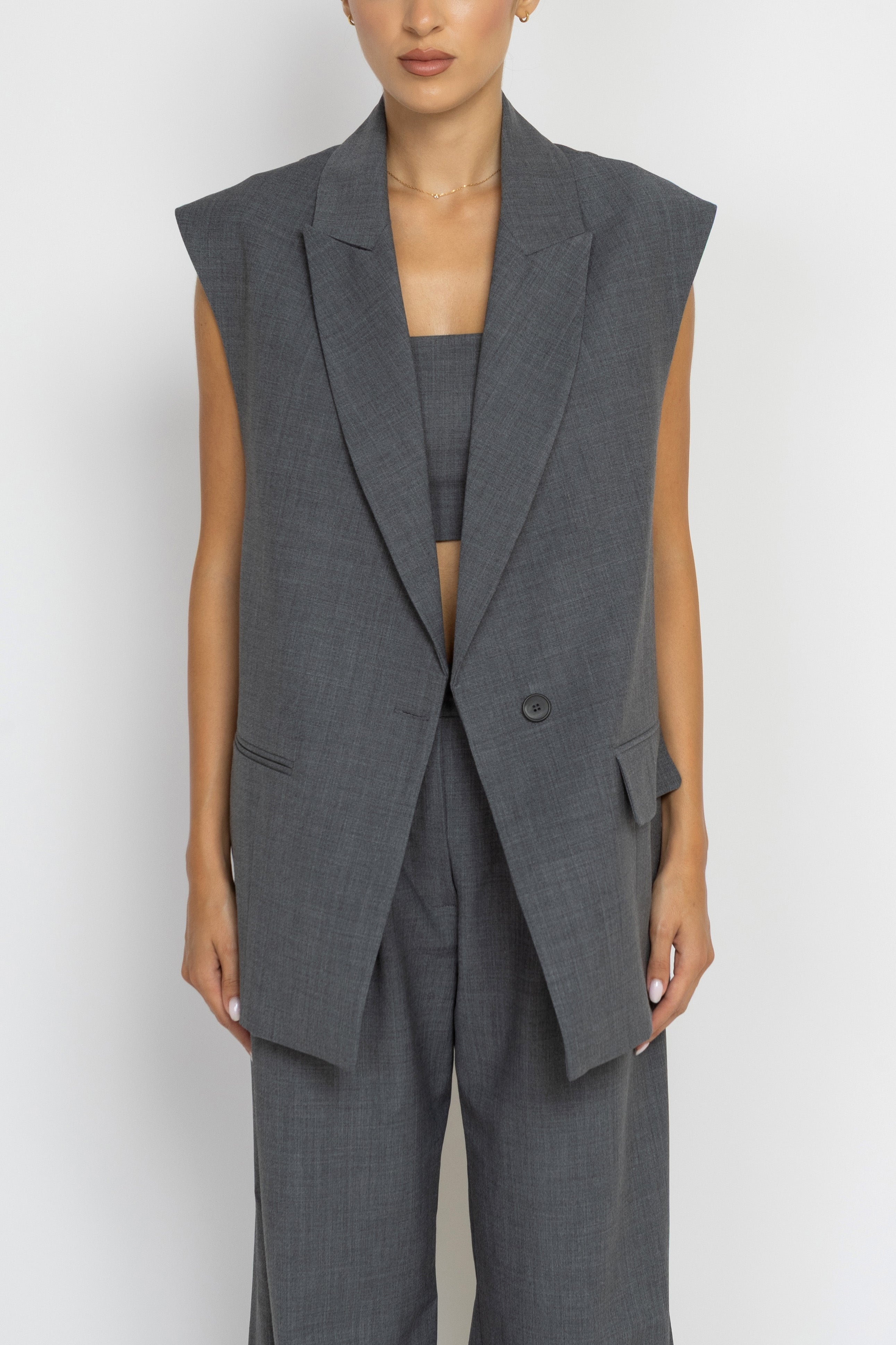 This sophisticated grey wool sleeveless blazer embodies understated elegance with its longline silhouette and impeccable tailoring. Featuring a front button closure, functional pockets, and a relaxed oversize fit, it offers both refinement and ease of movement. The versatile grey tone pairs effortlessly with matching pants to create a cohesive, polished ensemble, or stands alone as a statement layer over dresses and knitwear. Crafted from quality wool, this investment piece delivers timeless style for any occasion demanding understated luxury.